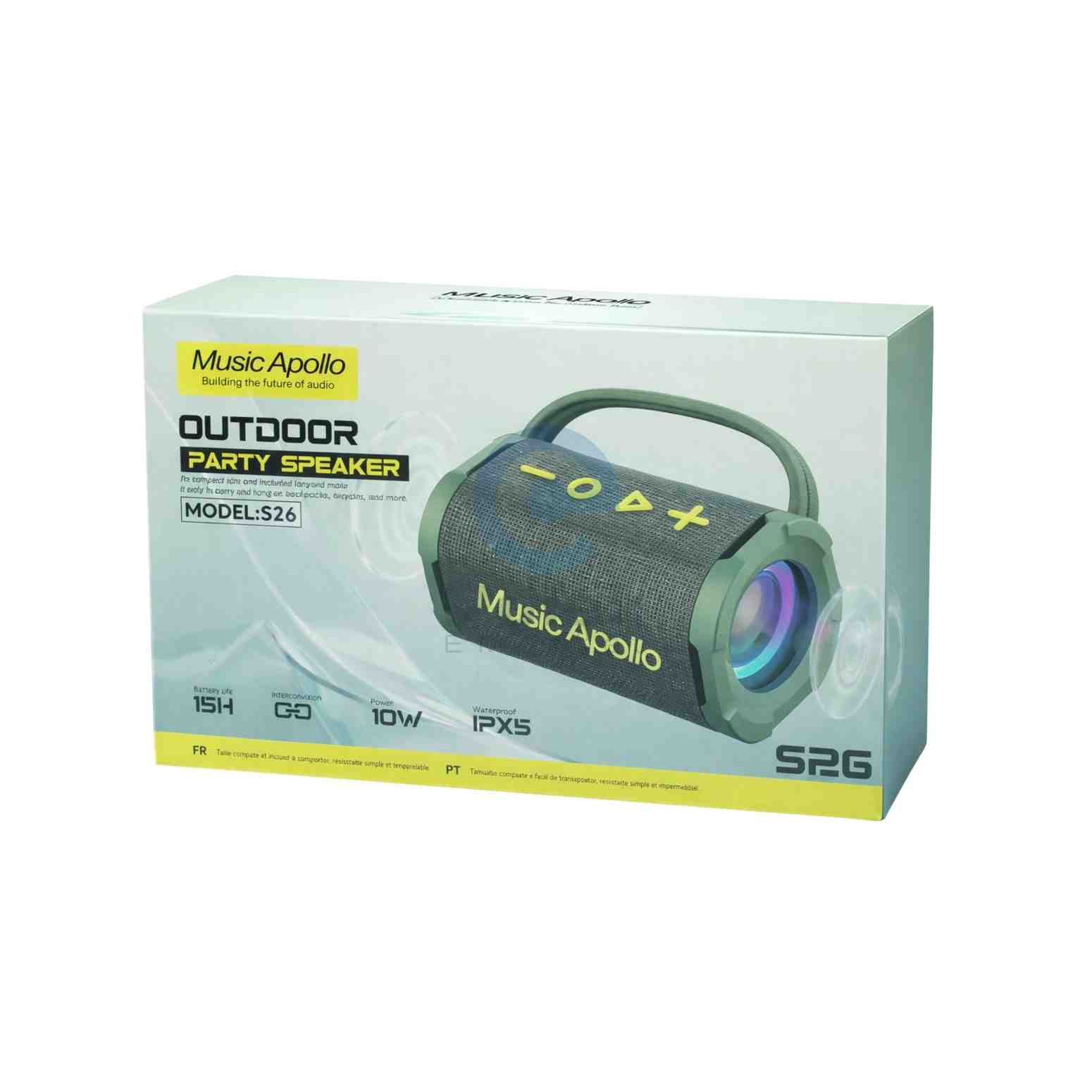 The Music Apollo S26 is a rugged and stylish portable outdoor speaker designed for powerful sound on the go. With a 10W output and enhanced 6D bass technology, it delivers clear and high-fidelity audio for music lovers. Built for outdoor use, it features an IPX5 water-resistant rating, protecting it from splashes and light rain.